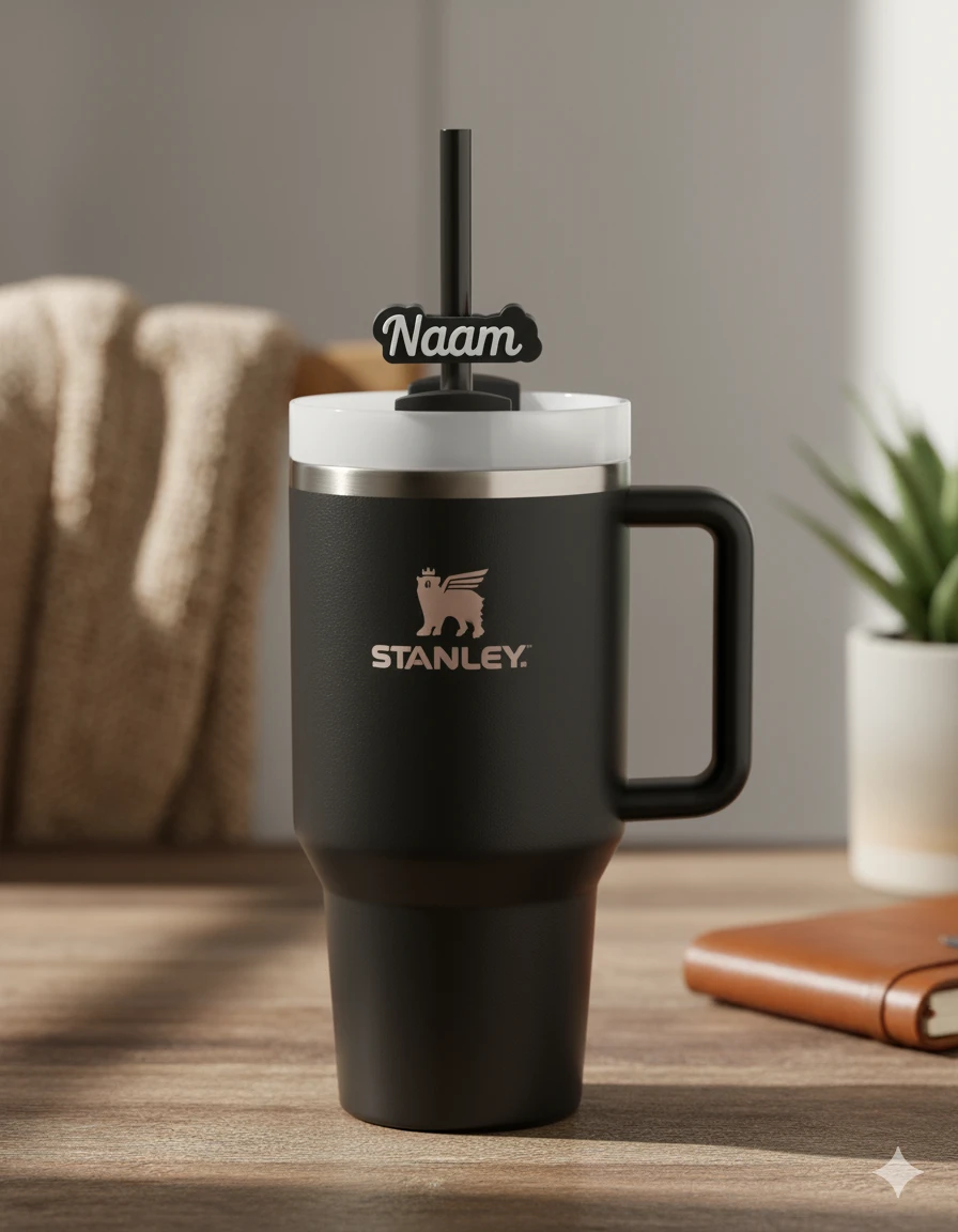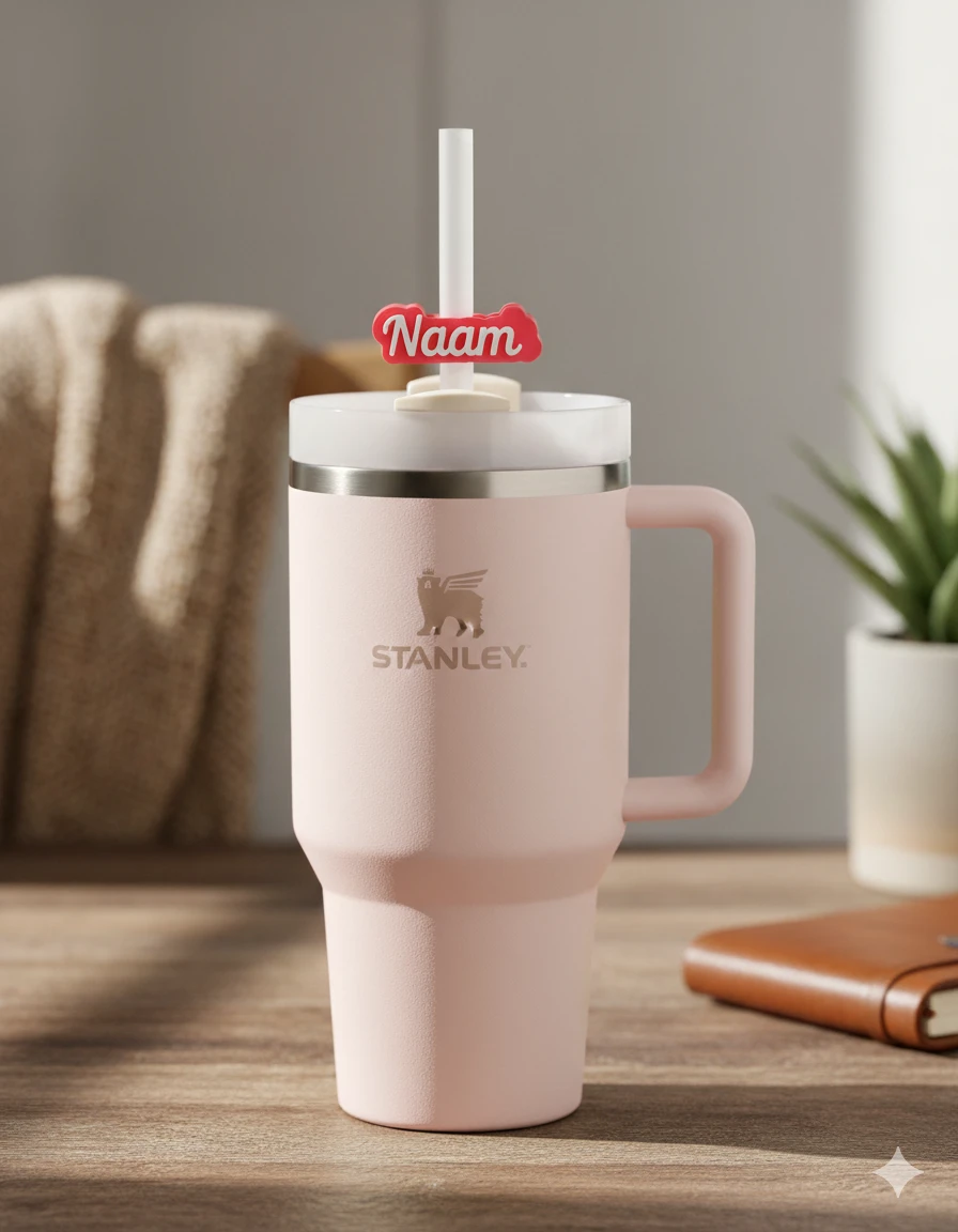 Maak elke beker uniek met deze 3D-geprinte rietjes topper met naam; ontworpen voor reguliere Stanley Quencher H2.0-rietjes en compatibel met rietjes met vergelijkbare diameter, zodat ook andere tumblers passen. De topper schuift stevig over het rietje en blijft netjes rechtop staan, ideaal voor dagelijks gebruik en cadeau‑momenten.