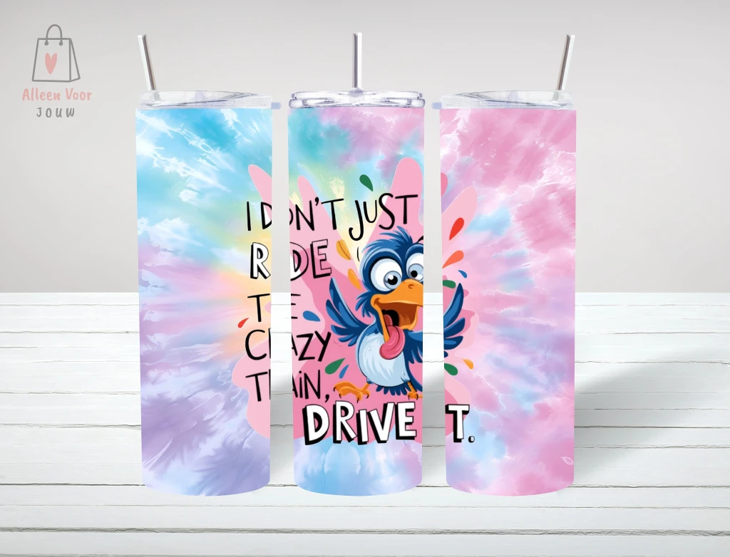 Breng kleur en een glimlach in je dag met onze unieke “I Don’t Just Ride the Crazy Train, I Drive It” tumbler, alleen te bestellen bij AlleenVoorJouw.nl. Deze opvallende tumbler combineert een grappige, cartoonachtige vogel met een kleurrijke tie-dye achtergrond en een speelse quote. Perfect voor iedereen die zichzelf niet te serieus neemt en graag positiviteit uitstraalt!